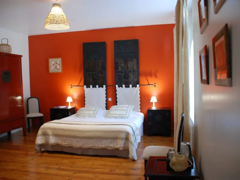 Nestling in the outbuilding, the "Santal" room for 2 to 3 people gives direct access to the park. Very modern and energising with its orange wall, varnished floor and original headboard.