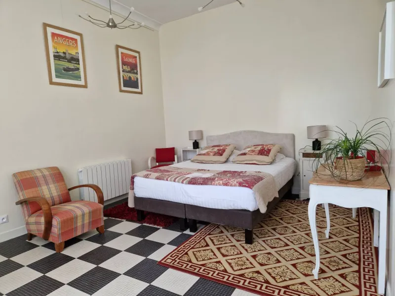 And finally, the spacious "Camélia" room for 3 people, with an extraordinary view over the Loire. The retro chic of this room is elegantly dressed in powerful, distinctive colours.