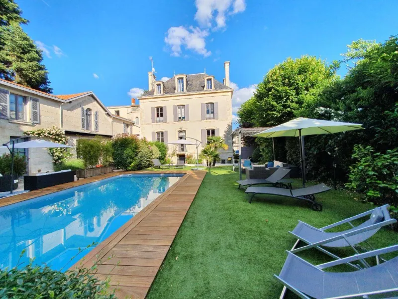 You will find in this late 19th century bourgeois house, located in the centre of Niort, the calm and refinement of 5 rooms and 2 studios furnished and decorated with taste. It is ideally located near the Bluegreen golf course in Niort (4 km), at the gateway to the Marais Poitevin (7 km), La Rochelle (45 mn) and the Futuroscope (55 mn) and Puy du Fou (1h15) parks. A large landscaped garden with deckchairs and parasols, a heated outdoor swimming pool (salt water) and a fitness room, await you for a successful tourist or professional stay. Beds 160x200, sheets, towels, pool towels and cleaning included. Free Wifi connection.Localisation