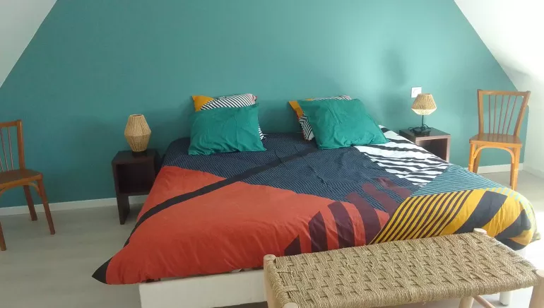 Upstairs bedroom with 180cm bed (can be separated on request) and single bed.