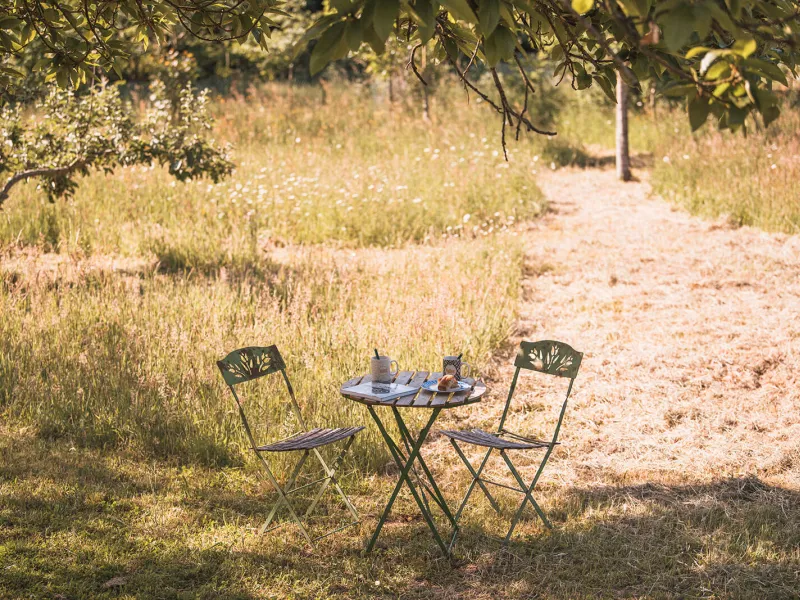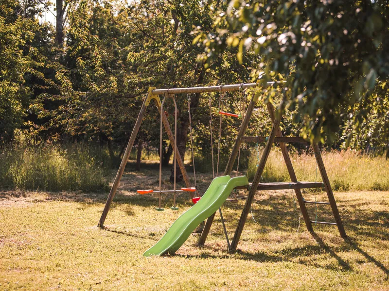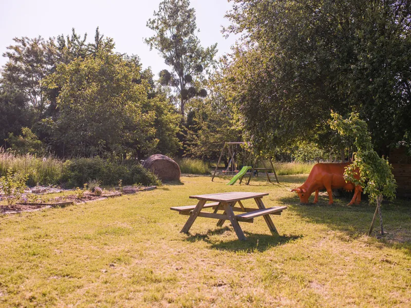 The gîte has a small, grassy, unfenced area with a small table (small road to cross). In addition, our large grounds of over one hectare (20 metres away) are completely accessible to you: outdoor games such as pétanque, molky, shuffleboard, table tennis, table football, balls, etc. orchard, vegetable garden, picnic table, swing, chickens, sheep, etc.
