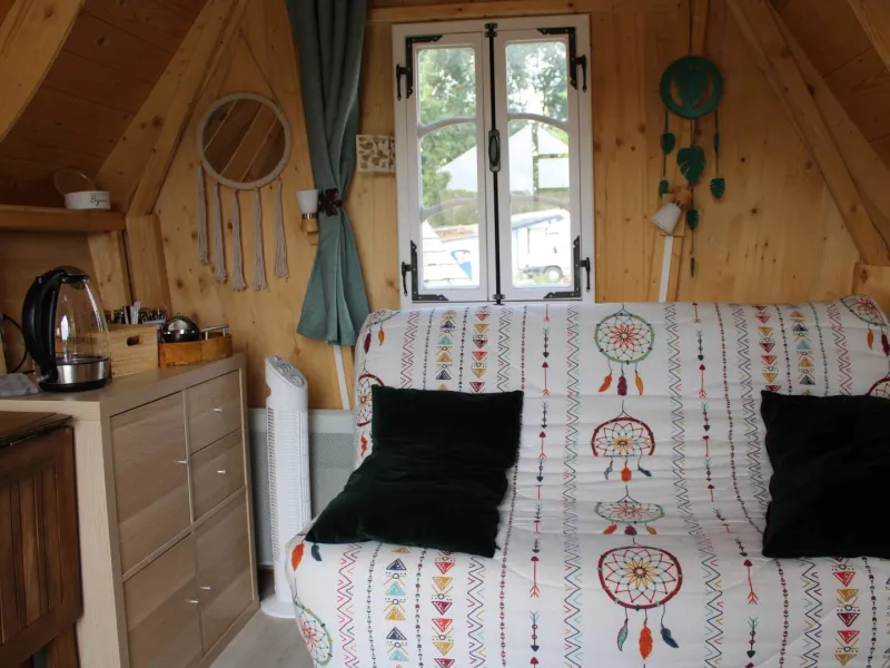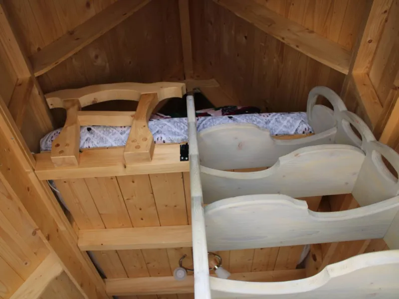 Sous son double toit tout pointu, cet hébergement recèle un petit secret... une mezzanine ! En bas, vous trouverez un canapé-lit BZ de 140 cm, une table avec des chaises pliantes qui vous permettent de choisir de manger à l'intérieur ou à l'extérieur au gré de vos envie ou de la température.