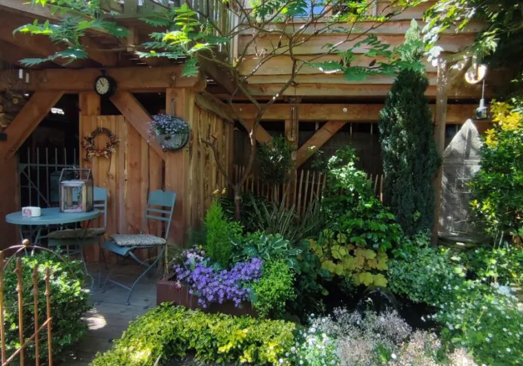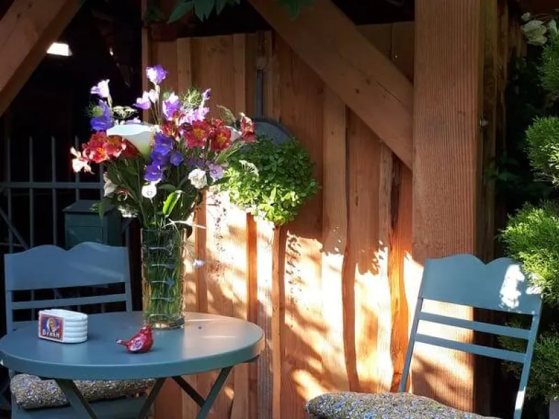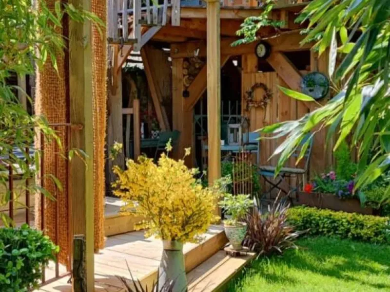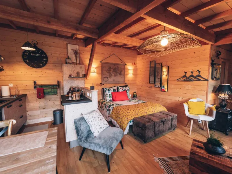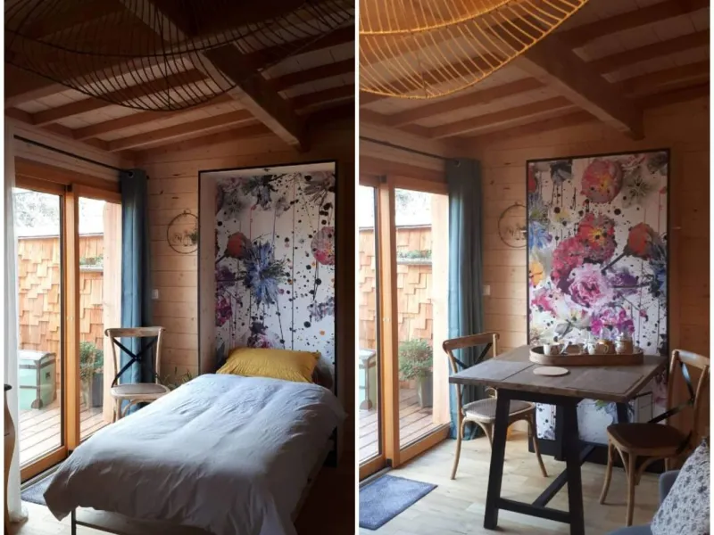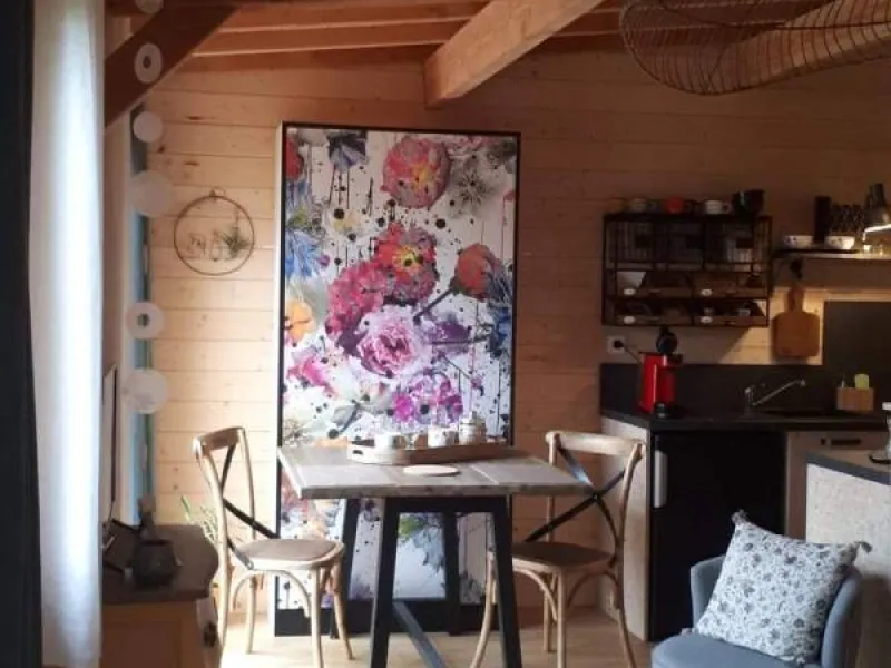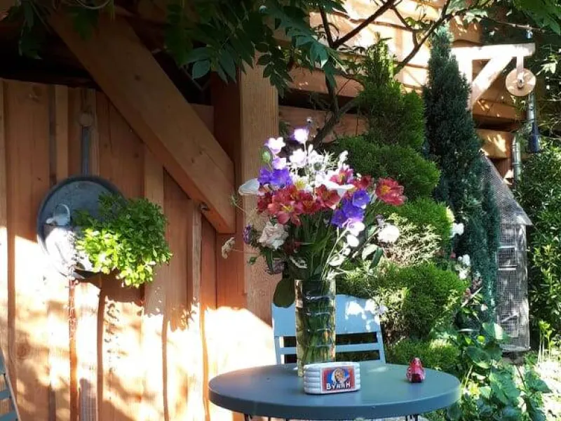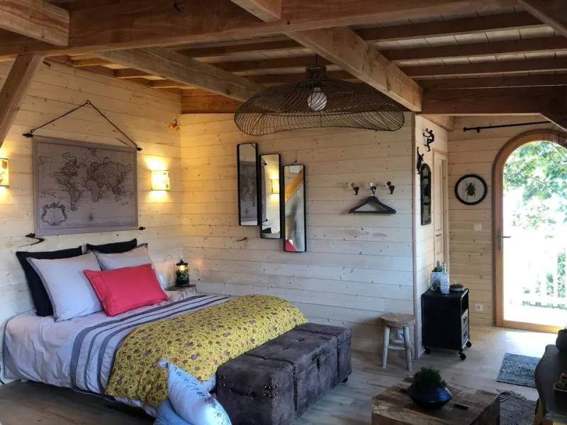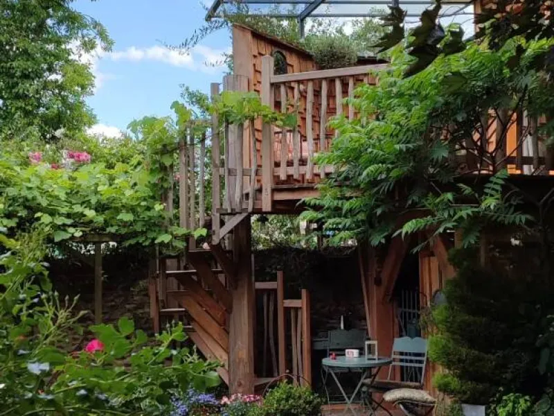 Olivier and Denis invite you to stay in their tree house perched at the bottom of their flower-filled garden.Situated at the bottom of our flower garden, easily accessible by a staircase skirting the maple trees, the Cabane du Bon Chemin, heated and insulated, offers a 26m2 space for your comfort, with TV and free Wi-Fi, including a cosy sleeping area: 1 double bed (140x190) and 1 pull-out bed (90x190). A fully-equipped kitchen area for longer stays, plus a bathroom with a large walk-in shower, washbasin and WC.