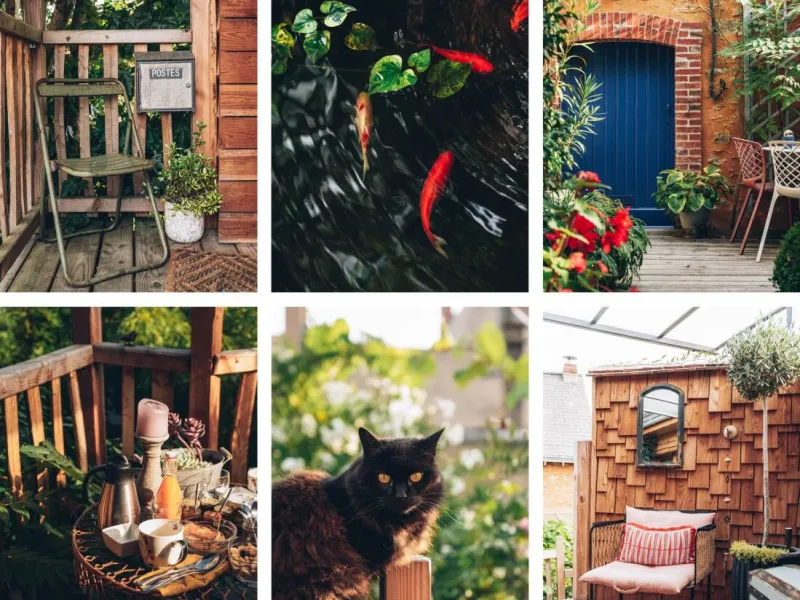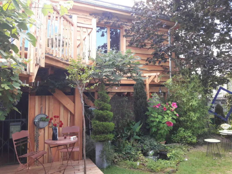 A bay window opens onto a private terrace of 7m² on stilts, covered by a glass roof overlooking the garden and pond. It offers a view of our stone house. A staircase leads to a second shaded terrace on the garden level, ideal for relaxing and enjoying nature.