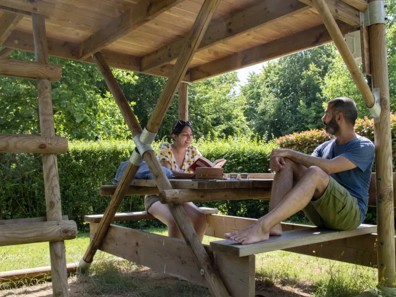 Three bivouac tents have been installed at the Gué Saint-Léonard campsite. This improved hut has a wooden structure and a strong canvas roof. This type of light accommodation (5 m²) sleeps 2 people. They are equipped with 2 single mattresses and 2 power sockets.A picnic table at the foot of the tent lets you enjoy the outdoors while being sheltered from the rain.