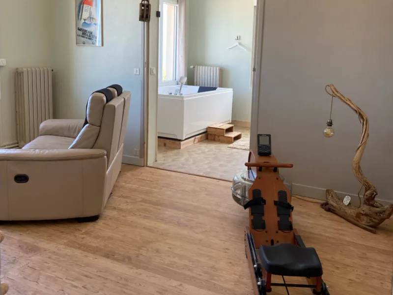 Upstairs, a Zen-style bedroom facing the sea, queen-size bed under a starry LED sky. Herbal tea room and fitness area facing the sea, with an en suite whirlpool bath in front of the bay window and hydromassage bed. Large sensory shower opening onto the terrace where you will find the sauna equipped with a Huum stone stove. WC.